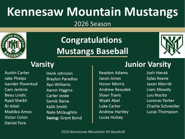 ANNOUNCEMENT!!! Congratulations to the 2026 Kennesaw Mountain Mustangs Baseball Teams:
